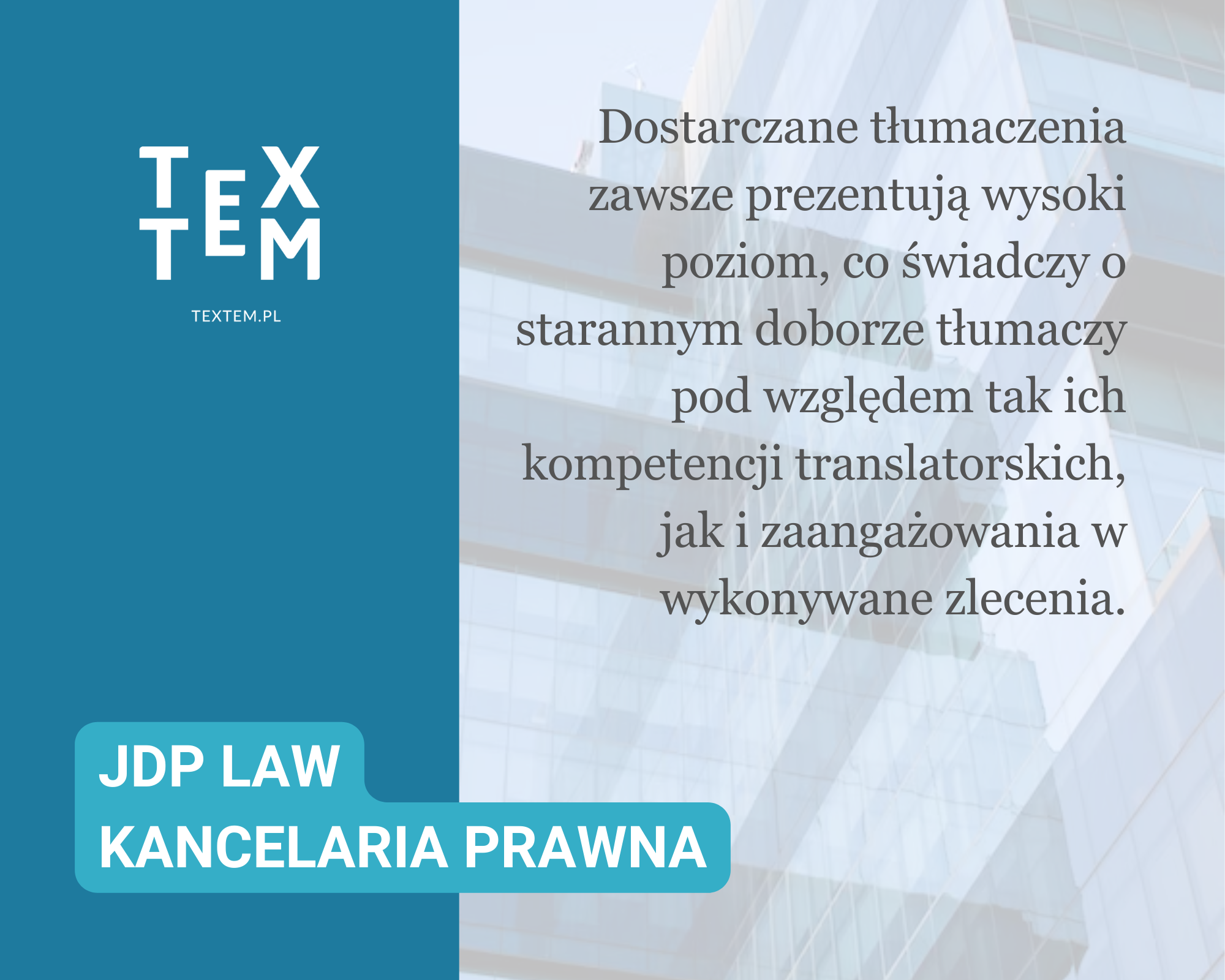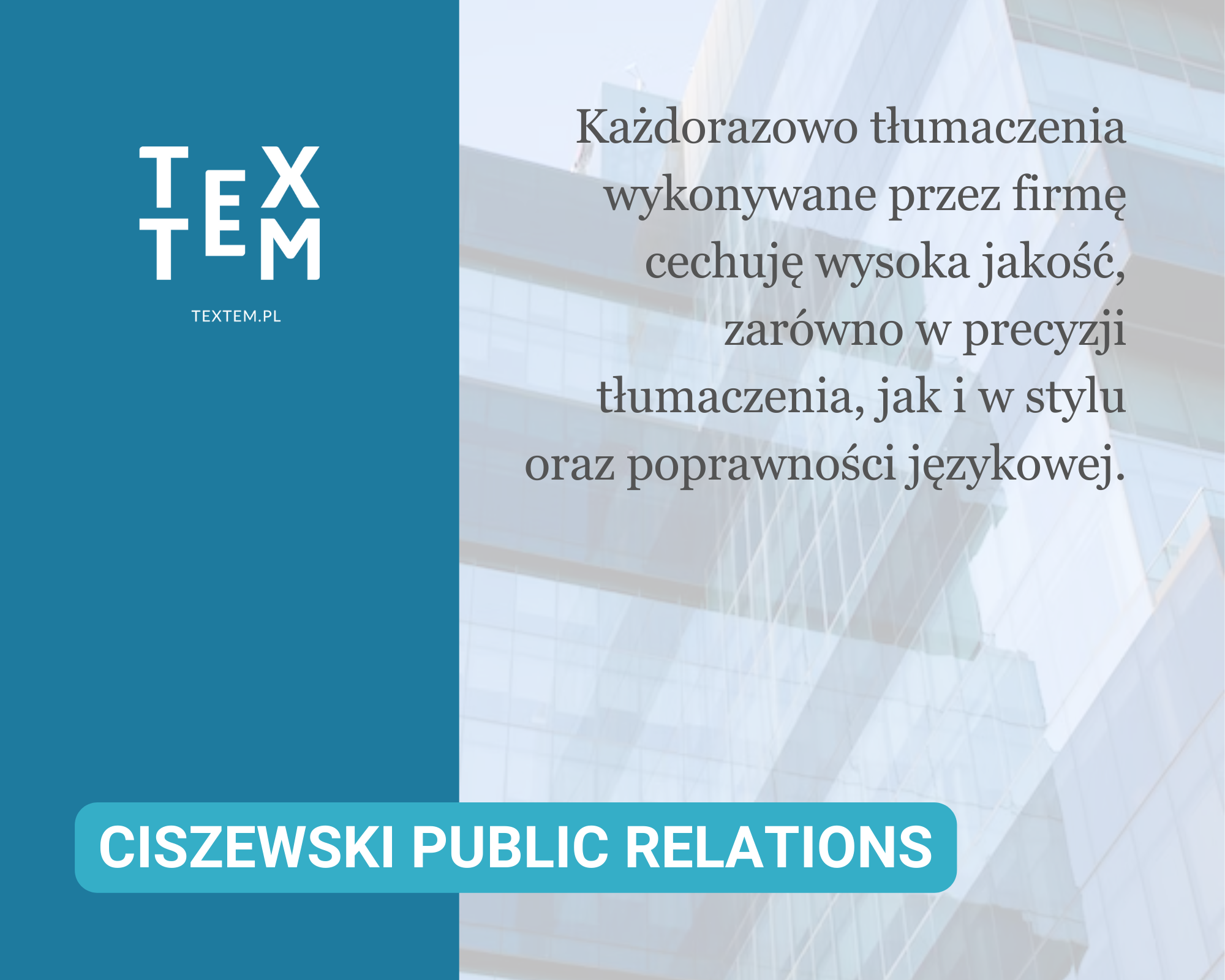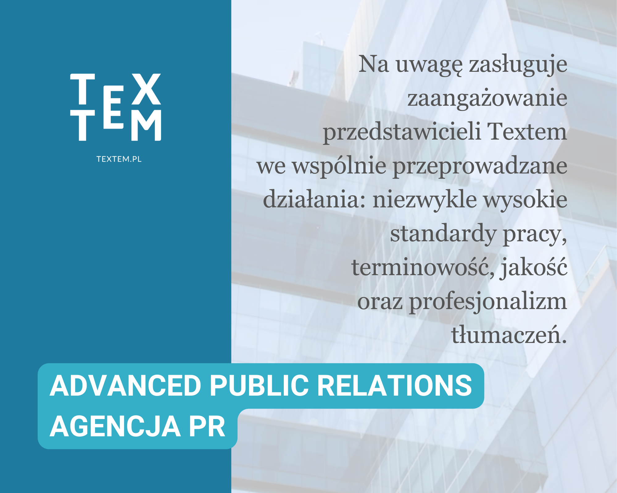 “Istotnymi atutami Textem są niezawodność, terminowość, a także sprawna komunikacja i elastyczność pozwalająca na rzetelną realizację nie raz pilnych zleceń. Cenimy również przejrzystość dokonywanej wyceny prac. Textem zdobyło nasze zaufanie i stało się ważnym partnerem codziennej pracy.”